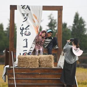 11月4日,小朋友在南浔区双林镇万亩稻虾综合种养示范区游览、拍照。