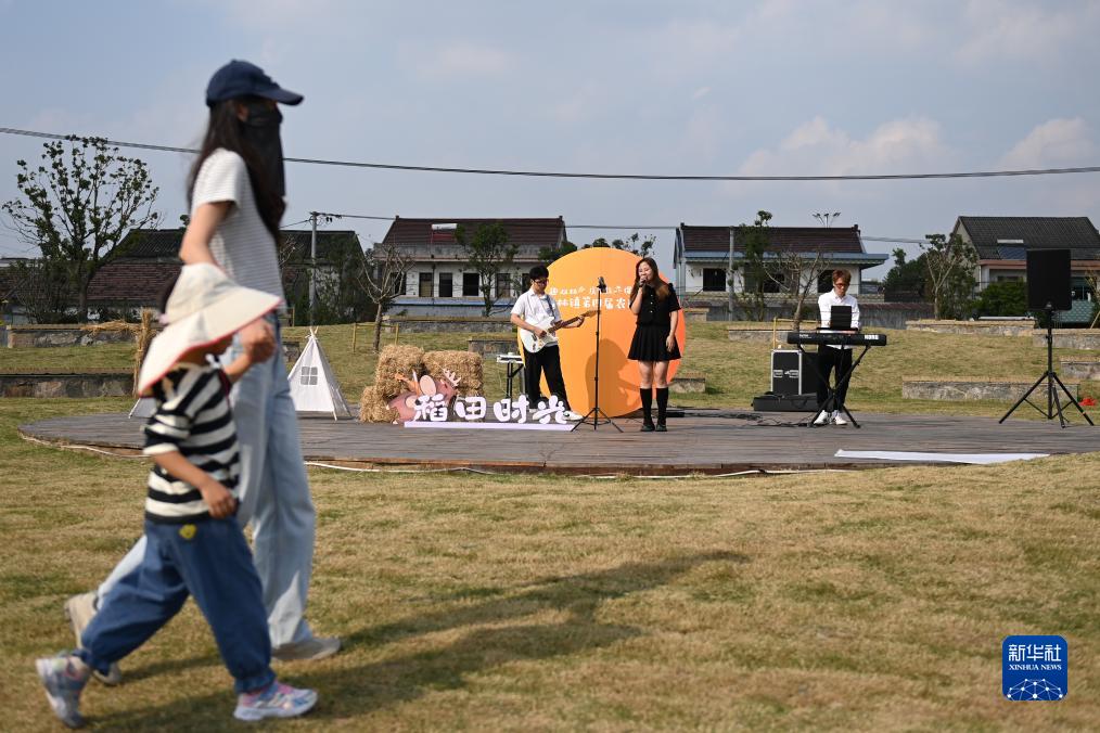 11月4日,歌手在南浔区双林镇万亩稻虾综合种养示范区的稻田音乐会上演唱。
