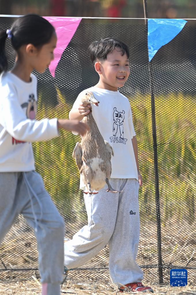 11月4日,小朋友在南浔区双林镇万亩稻虾综合种养示范区的稻田游园会捉鸭子。