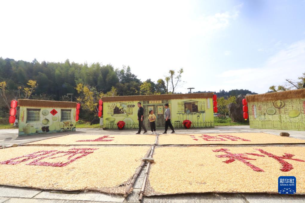 秋收时节,农民利用晴好天气在房前屋后晾晒农作物,一派丰收景象。
