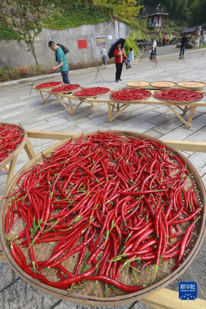 秋收时节,农民利用晴好天气在房前屋后晾晒农作物,一派丰收景象。
