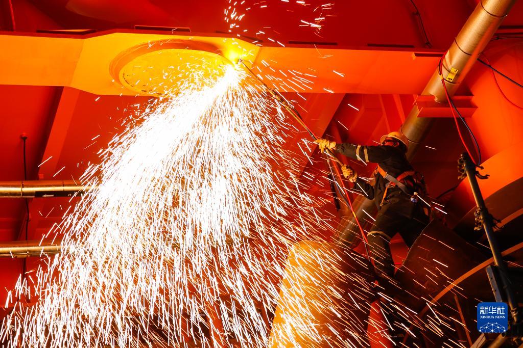 11月4日,工人在埕北油田中心平台作业现场进行切割作业。
