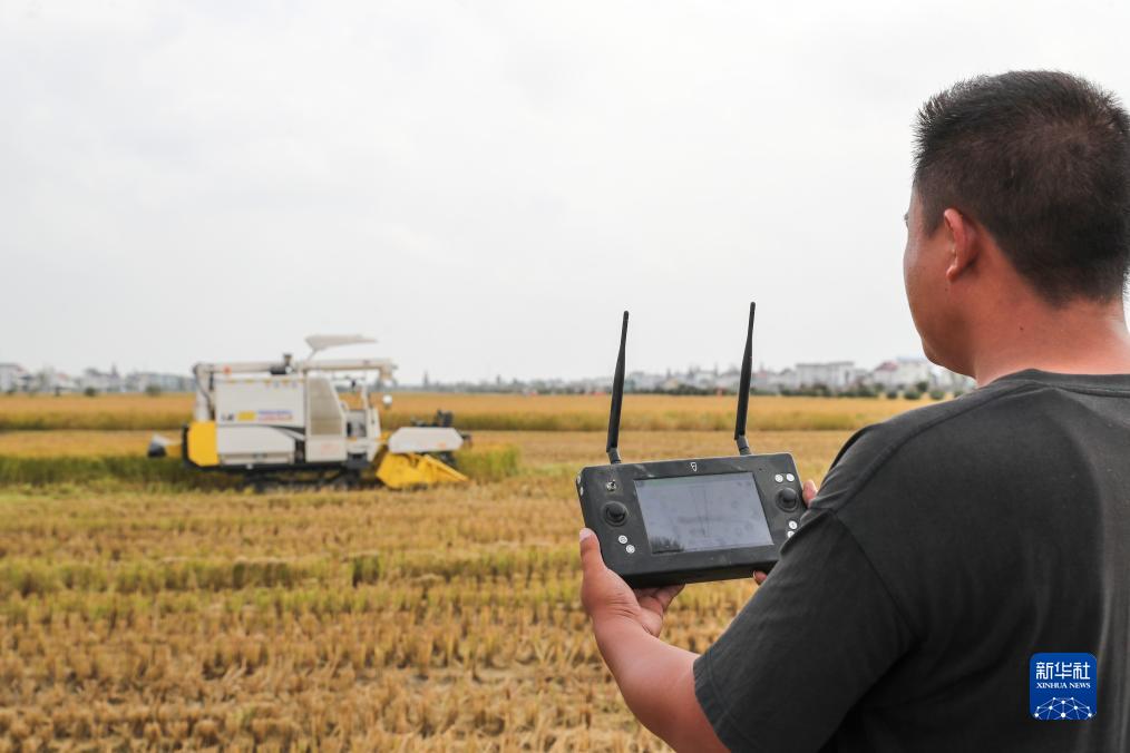 11月4日,在南通市通州区十总镇育民村农场,技术员查看一台设置好参数的无人收割机工作情况。