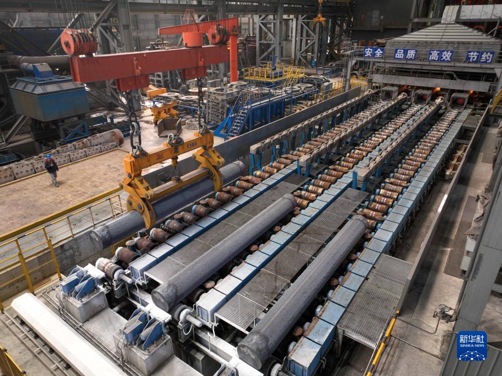 11月4日,在承德市营子区一家特殊钢生产企业,工人利用天车吊装连铸圆坯(无人机照片)。