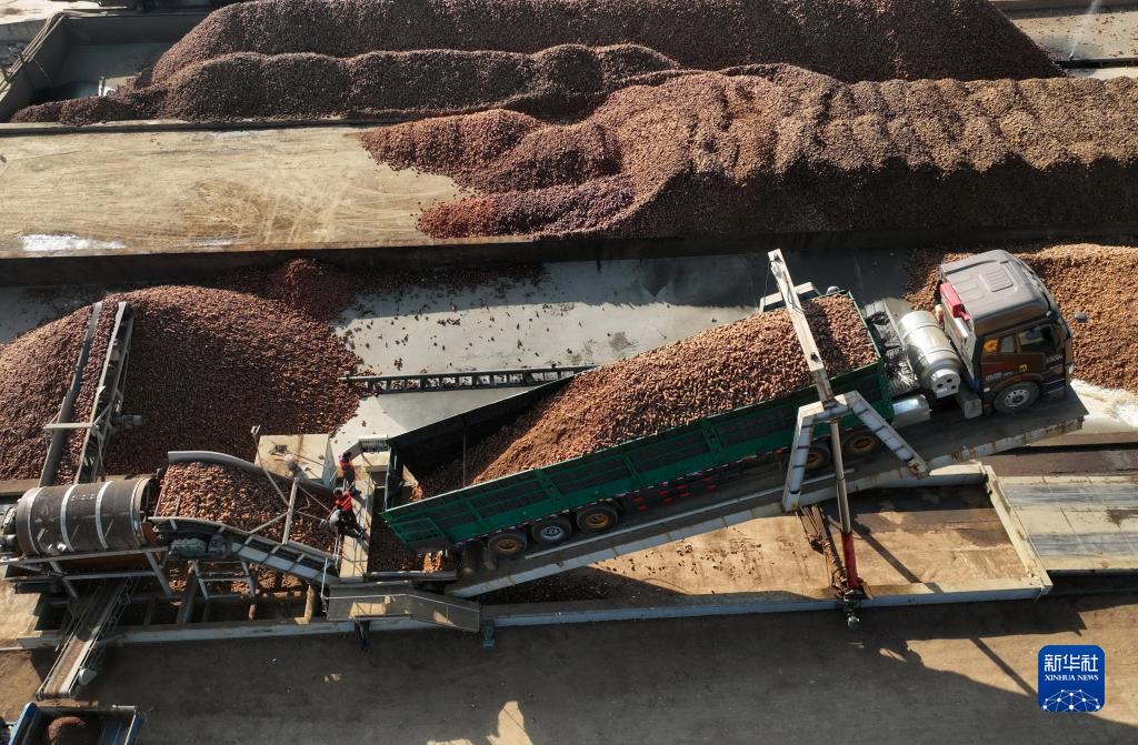 11月4日,河北省卢龙县一家甘薯深加工企业的工人在卸载从农民手中收购的甘薯(无人机照片)。
