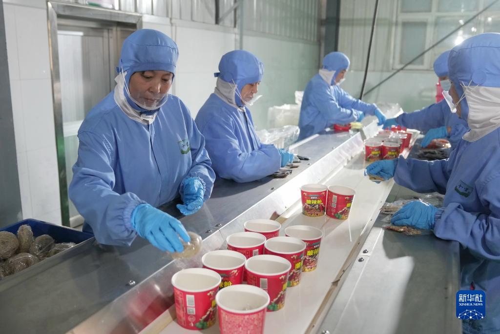 11月4日,工人在河北省卢龙县一家甘薯深加工企业的酸辣粉生产线上工作。