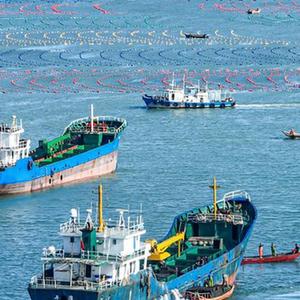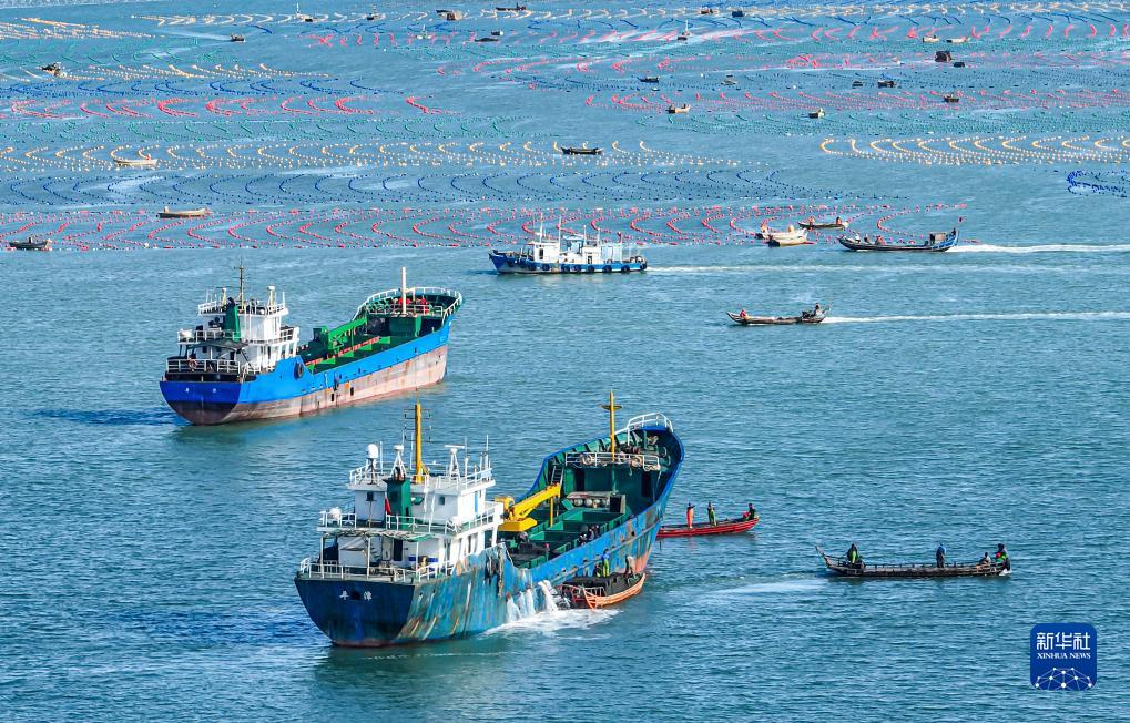 11月4日,在荣成市爱伦湾海域鲍鱼养殖区,养殖户将鲍鱼装船(无人机照片)。