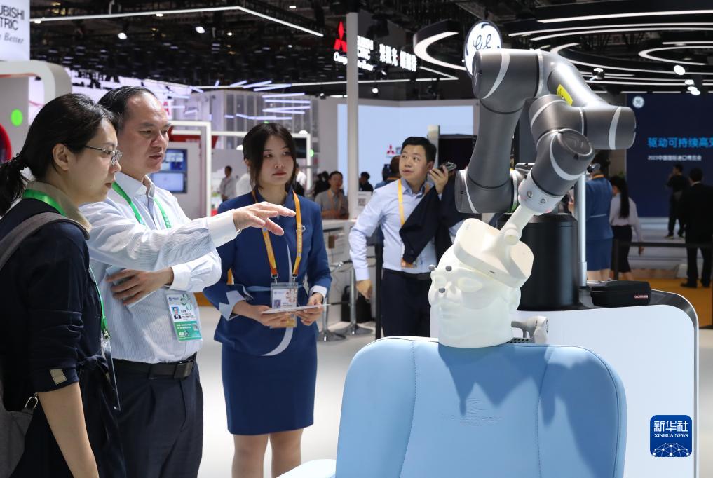 11月5日,参观者在第六届进博会欧姆龙公司展出的黑海豚靶向磁刺激机器人展品旁交流。