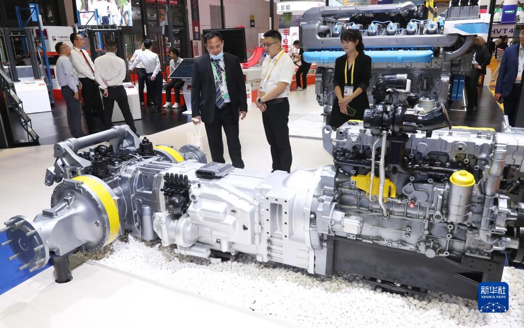 11月5日,参观者在第六届进博会林德公司展出的的大马力拖拉机CVT动力总成系统模型展品旁交流。