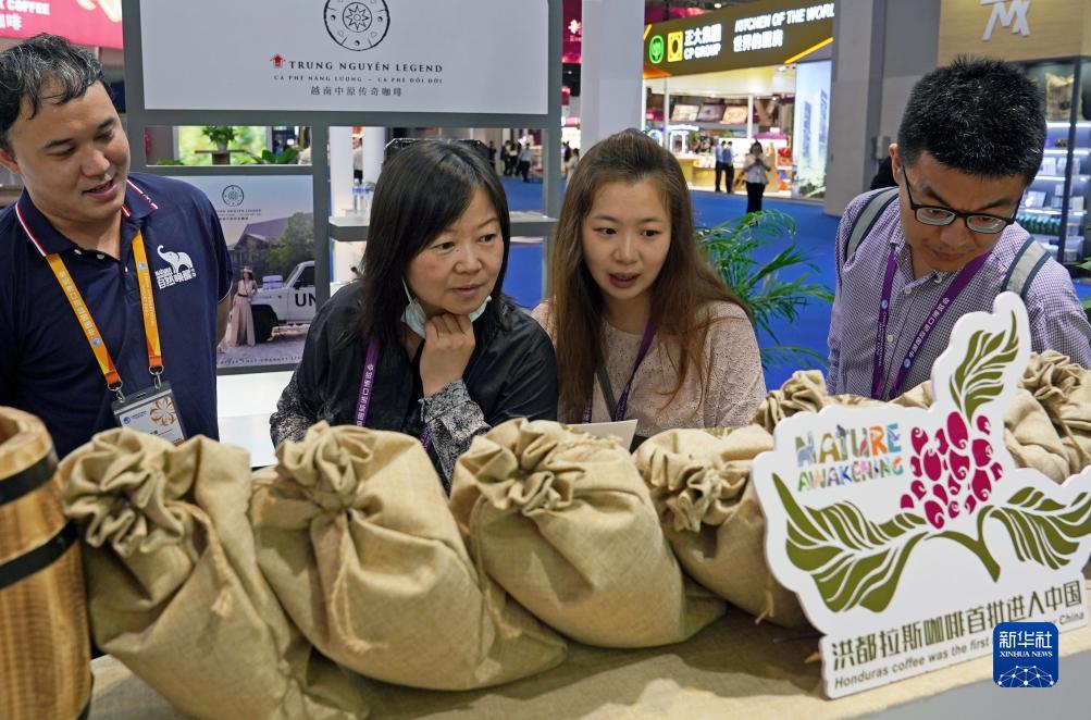 11月5日,观众在第六届进博会食品及农产品展区参观首次亮相中国的洪都拉斯咖啡豆。