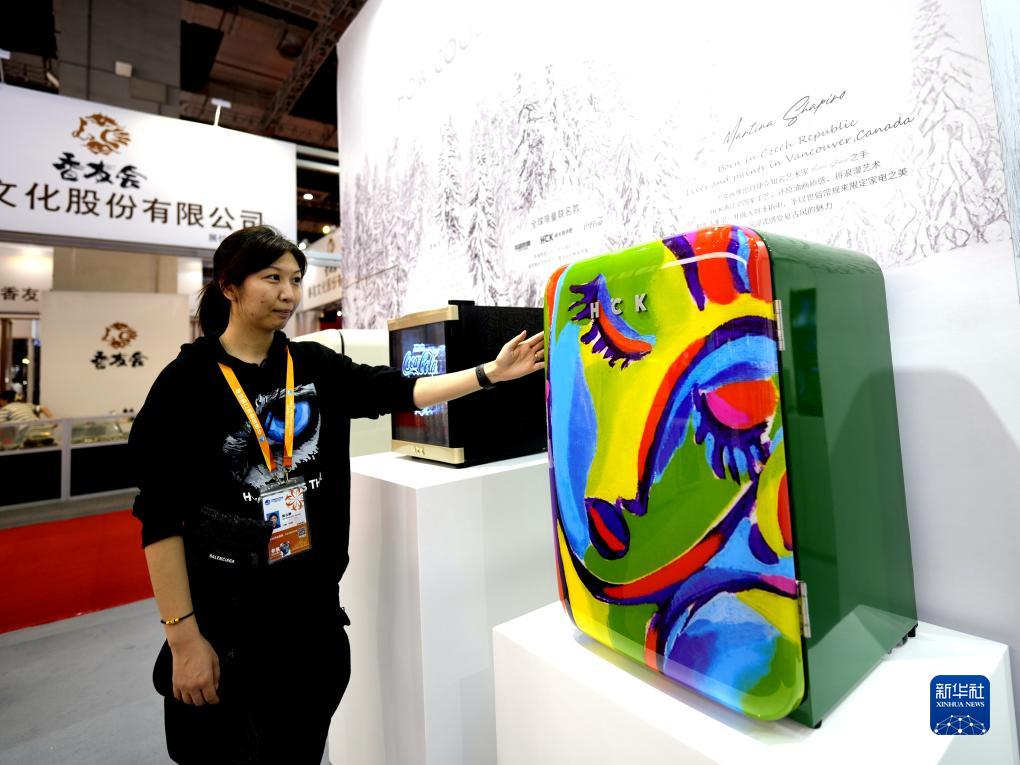 11月5日,在第六届进博会消费品展区HCK哈士奇冰吧展台,工作人员介绍首次展示的一款复古冰箱。