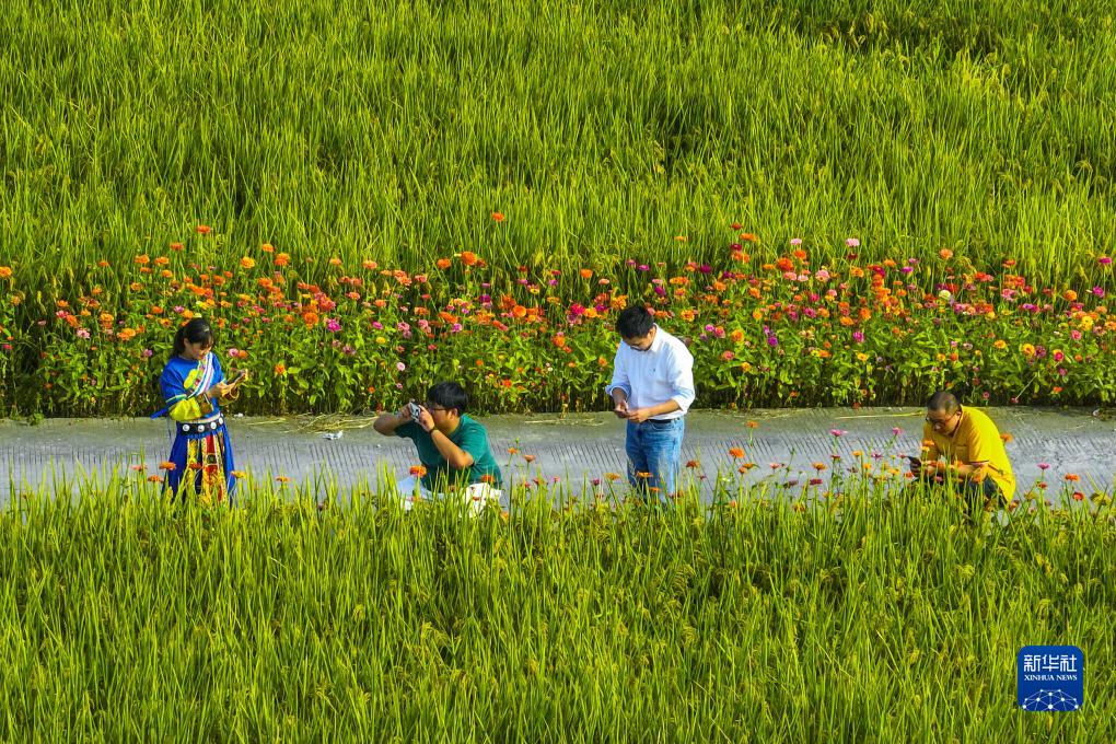 11月4日,在浙江省余姚市三七市镇魏家桥村,游客在稻田边游玩拍照(无人机照片)。