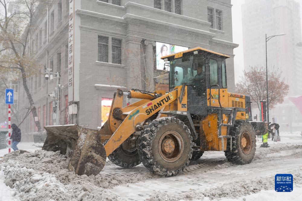 11月6日,一辆铲车在哈尔滨中央大街上铲除积雪。