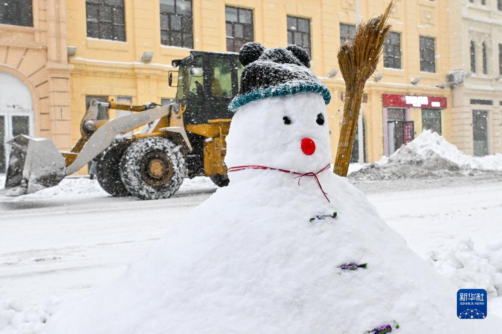 这是11月6日在哈尔滨中央大街附近拍摄的雪人,铲雪车在一旁铲除积雪。