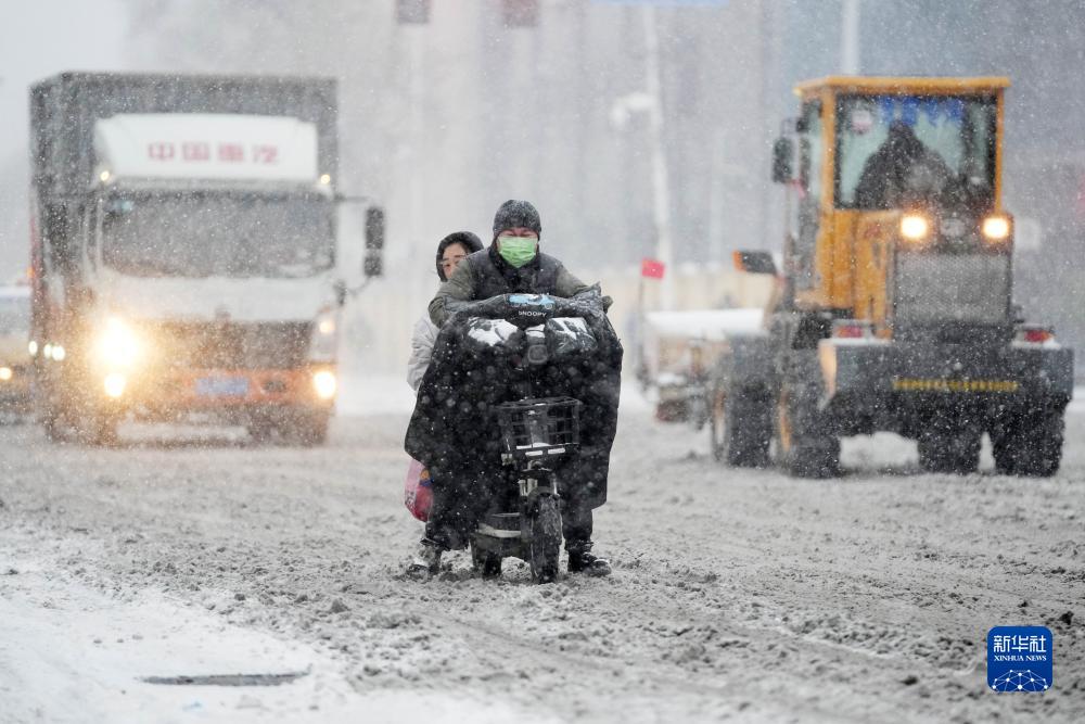 11月6日,哈尔滨市民在风雪中骑车出行。