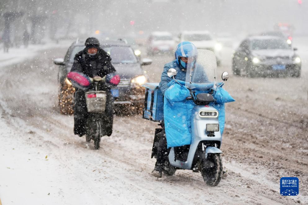 11月6日,哈尔滨市民在风雪中骑车出行。