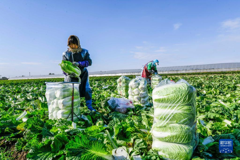 11月6日,河北省玉田县虹桥镇农民在收获包装白菜。