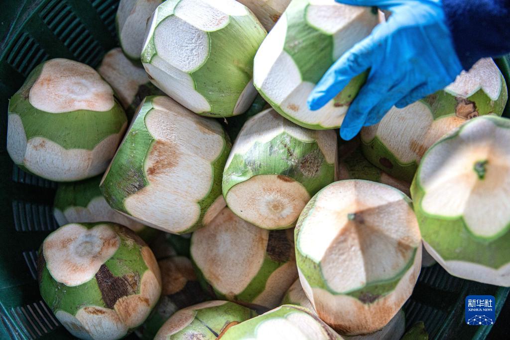 11月3日,工人在泰国叻武里府丹嫩沙多的椰子工厂码放椰子。