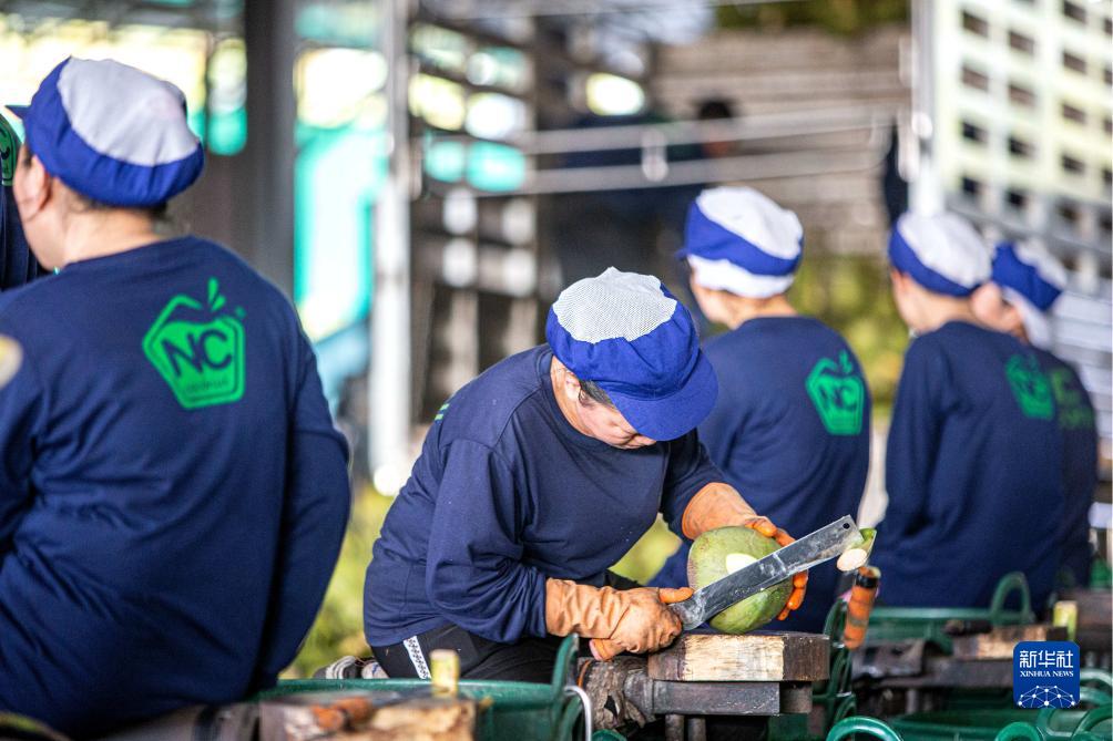 11月3日,工人在泰国叻武里府丹嫩沙多的椰子工厂切割椰子。