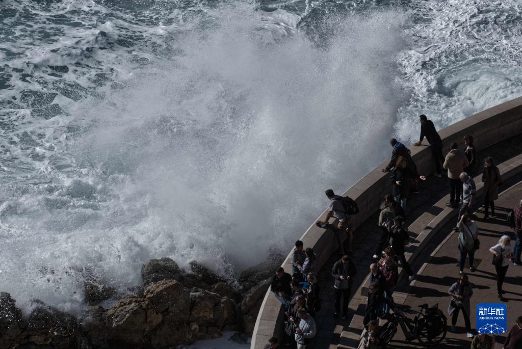 近日,受风暴天气影响,法国尼斯海岸巨浪拍岸,吸引人们驻足观看。