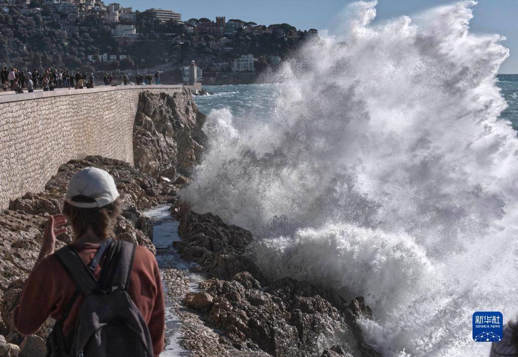 近日,受风暴天气影响,法国尼斯海岸巨浪拍岸,吸引人们驻足观看。