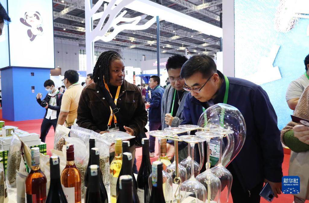 11月6日,来自坦桑尼亚的艾斯黛拉(前左)向参观者介绍展品。今天是艾斯黛拉来中国的第二天,她表示参加进博会让她感到很高兴。艾斯黛拉说等进博会闭幕后她要在上海游览一下,希望自己的公司能在中国找到合作伙伴。