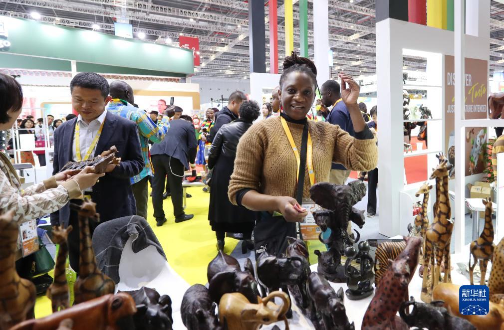 11月6日,来自津巴布韦的艾薇顿丝·察卡瓦站在她带来的木雕作品后。这是她第一次来到中国上海参加进博会,这些木雕都是她的哥哥在家里制作的,她想通过进博会为哥哥的木雕作品找到好的销路。