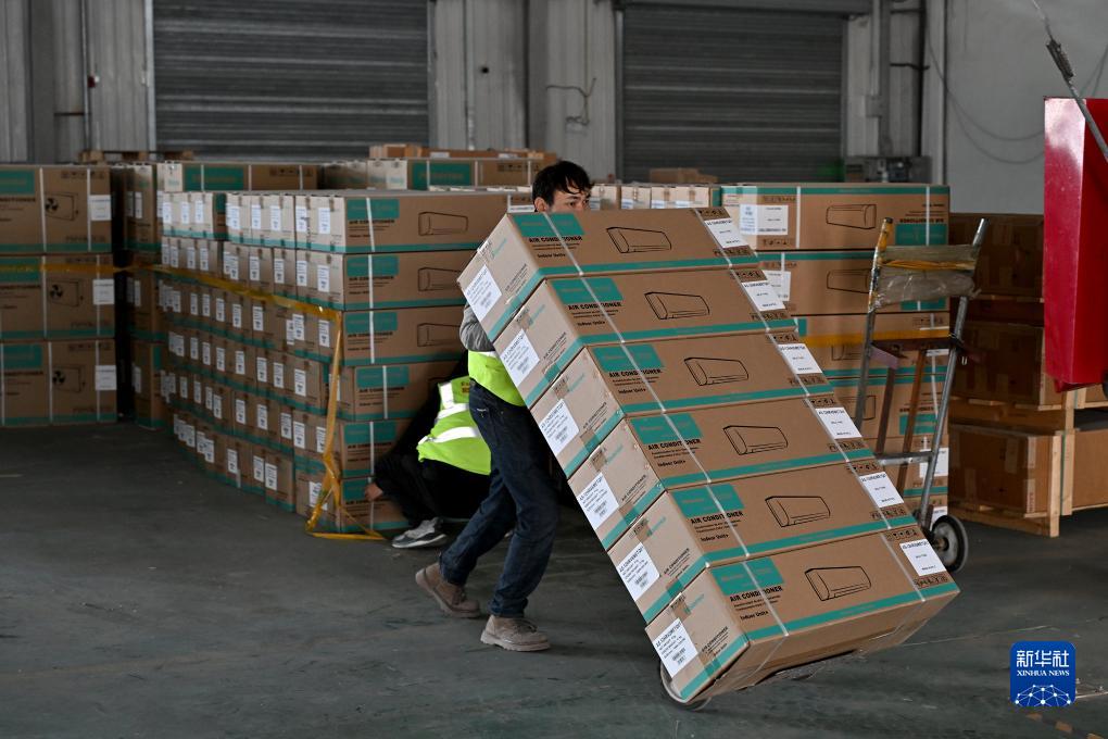 11月4日,在阿拉山口综合保税区内的跨境电子商务分拣清关中心,工作人员将国产空调装车准备运往国外。