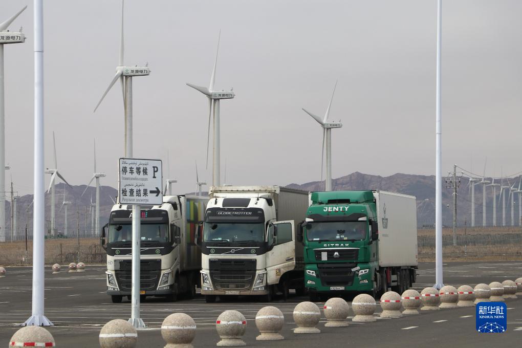 11月5日,入境货车在阿拉山口公路口岸停车场等待检查结果。