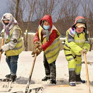 11月6日,工人在哈尔滨友谊西路上铲除积雪。