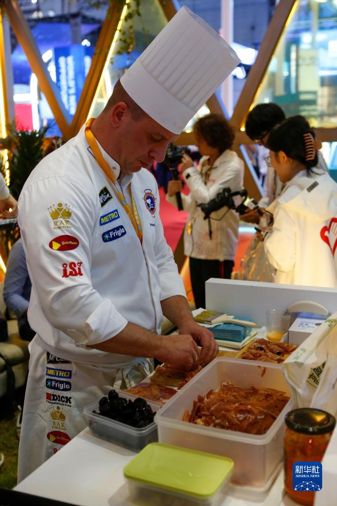 11月6日,来自第六届进博会国家展塞尔维亚展台的工作人员在展会现场制作塞尔维亚特色美食。