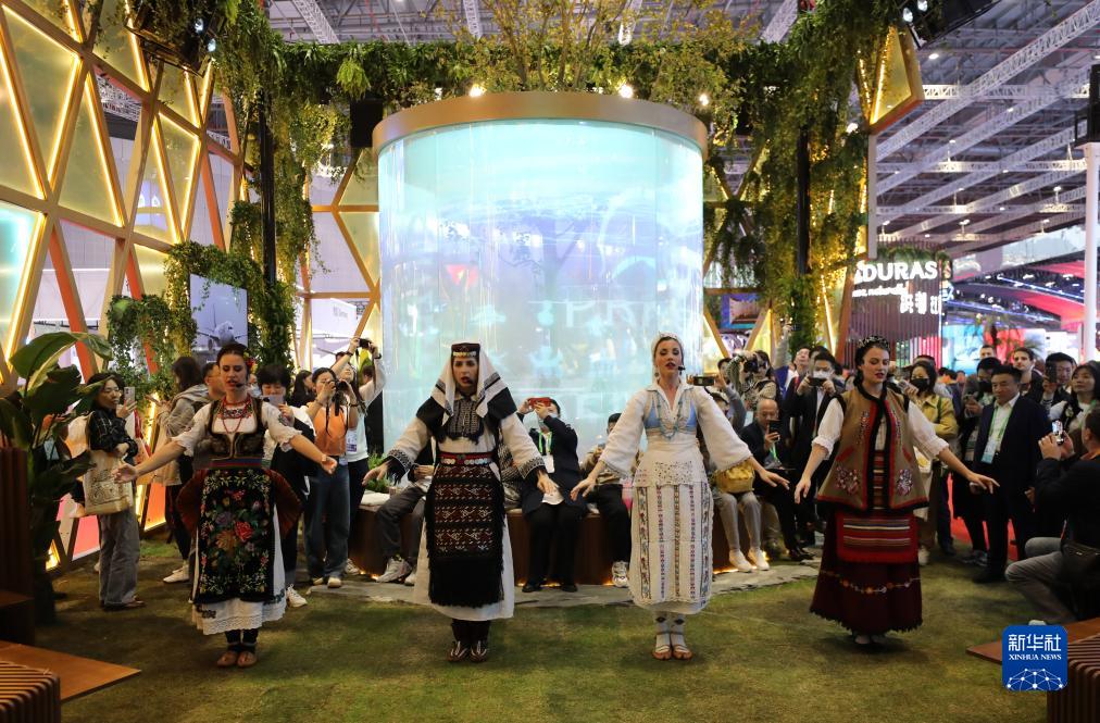 11月6日,在第六届进博会国家展塞尔维亚展台,参观者在观看舞蹈。