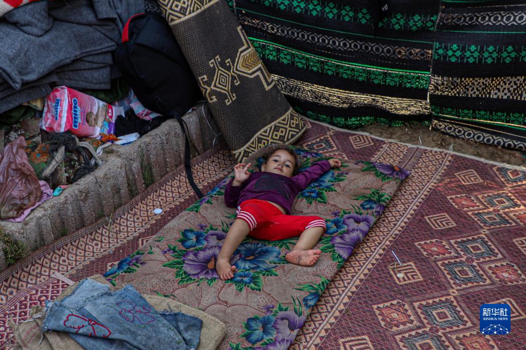11月6日,一名儿童在加沙地带南部城市汗尤尼斯的一处临时难民营内休息。