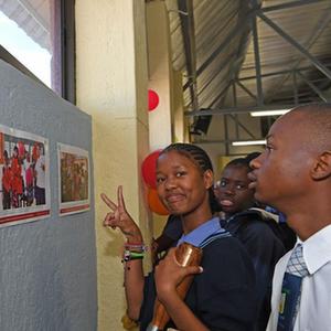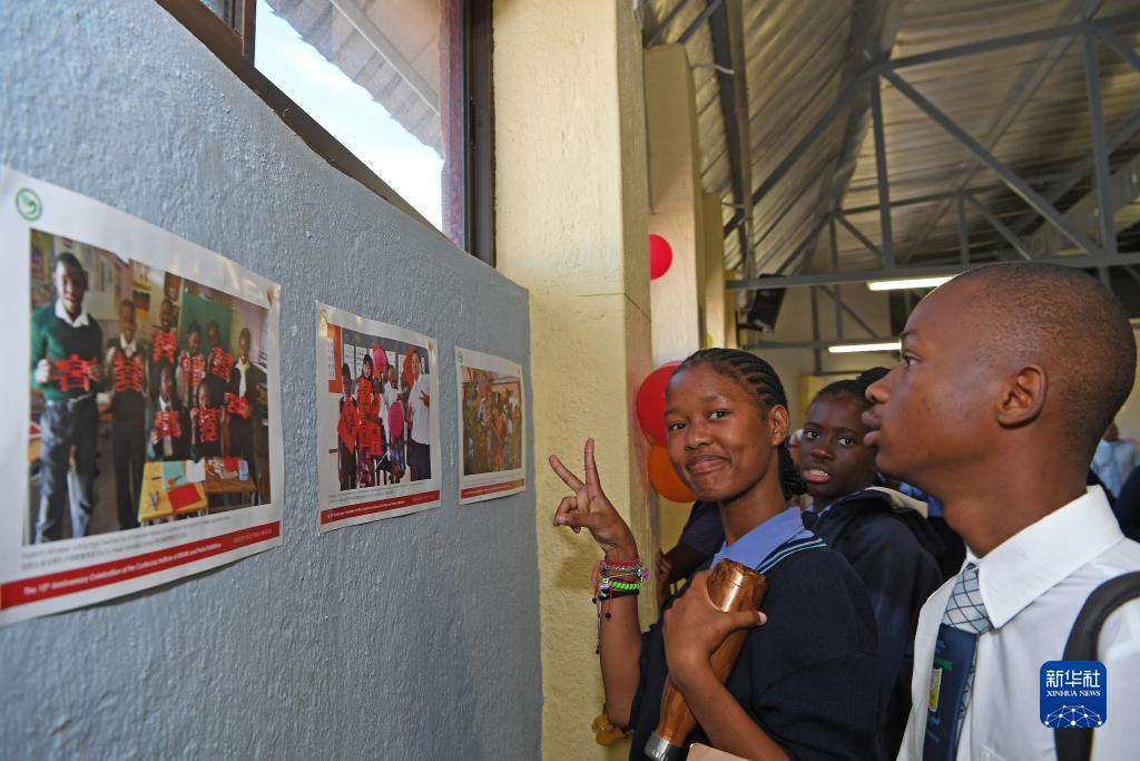 11月6日,学生在纳米比亚温得和克举行的纳米比亚大学孔子学院建院十周年庆典上观看图片展。