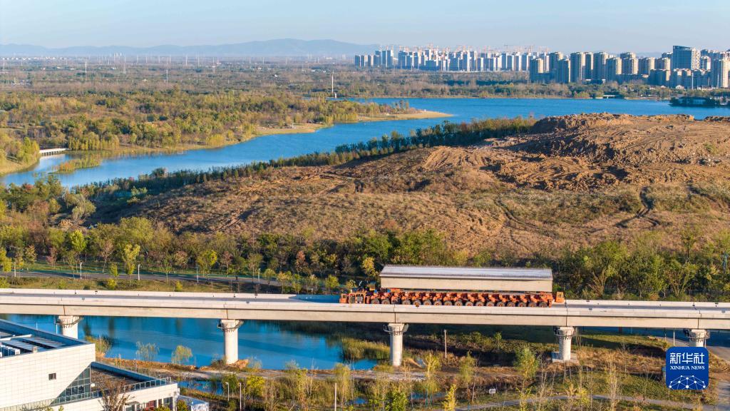 施工车辆在中铁四局合新铁路安徽段运送箱梁(11月6日摄,无人机照片)。