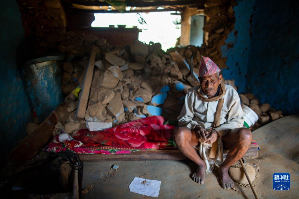 11月6日,一名男子坐在尼泊尔西部扎泽尔果德地震灾区的建筑物废墟内。