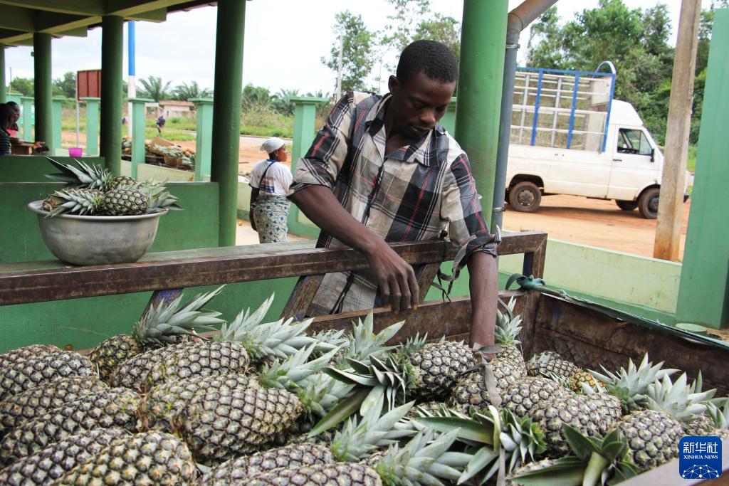 10月23日,一名男子在贝宁“甜面包”菠萝主产区阿拉达的一处菠萝收购点卸下菠萝。