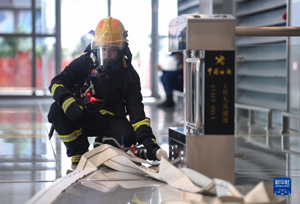 11月7日,在港珠澳大桥珠海公路口岸旅检大楼,广东消防员在演练中布设水带。