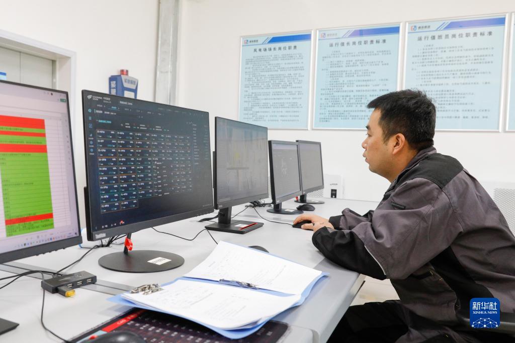 11月7日,在甘肃省酒泉市瓜州县泰源桥南第三风电场,工作人员在中控室监测风电场运行情况。
