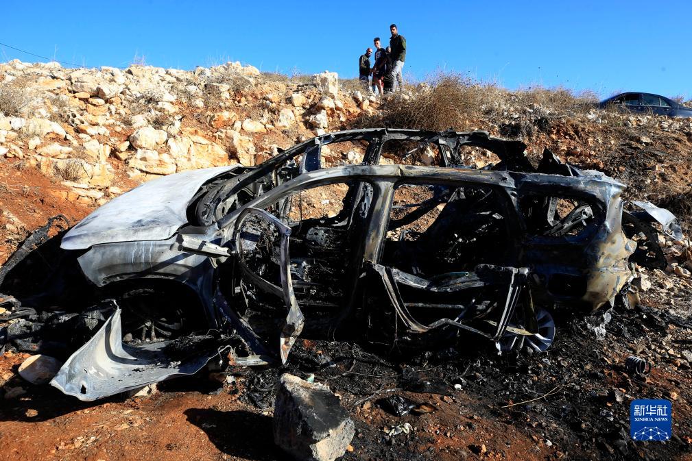 这是11月6日在黎巴嫩南部艾纳塔拍摄的被以色列无人机炸毁的车辆残骸。