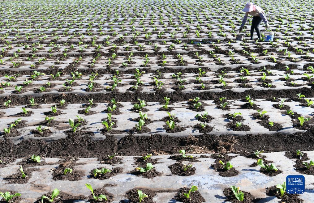 11月7日,在云南省丽江市玉龙县黄山街道长水社区,农民给菜苗浇水。