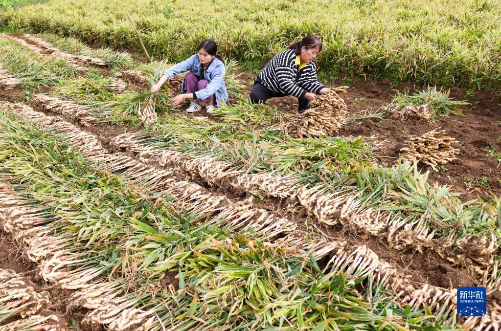 11月7日,在贵州省铜仁市玉屏侗族自治县平溪街道马头田村,农民在田间收获生姜。