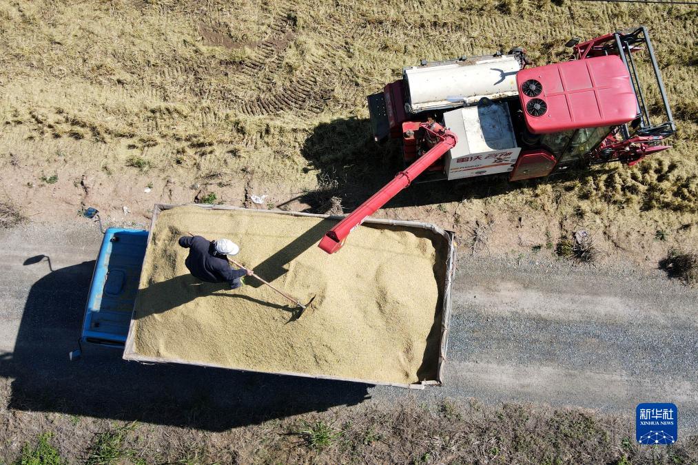 11月7日,在安徽省芜湖市繁昌区荻港镇,村民将收割的水稻装车(无人机照片)。