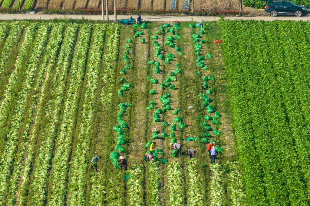 11月7日,浙江省余姚市黄家埠镇农户在田间收割蔬菜(无人机照片)。