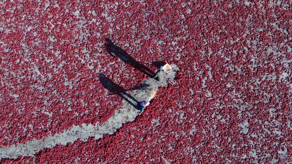 11月7日,甘肃省定西市安定区凤翔镇李家咀村的农民在晾晒辣椒(无人机照片)。