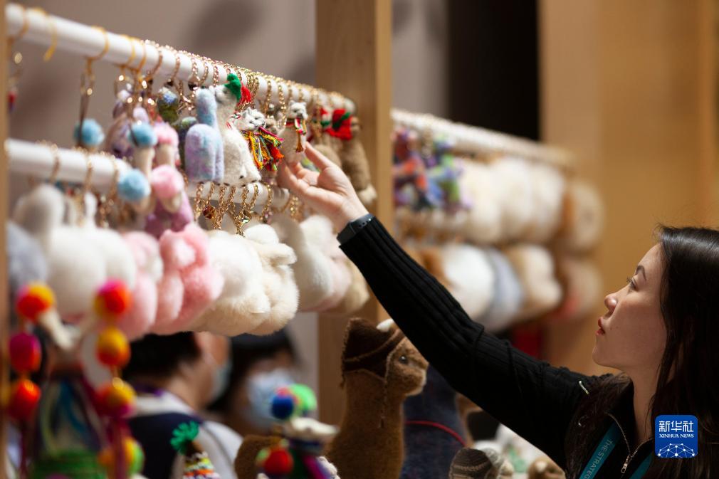 11月7日,参观者在上海进博会“温暖驼”品牌展台挑选羊驼玩偶。