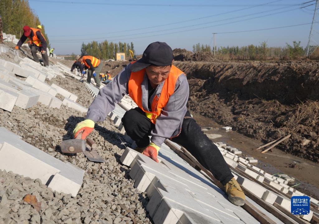 11月7日,工人在唐山市丰南区王兰庄镇彭家庄村灌溉水渠护坡加固工地施工。