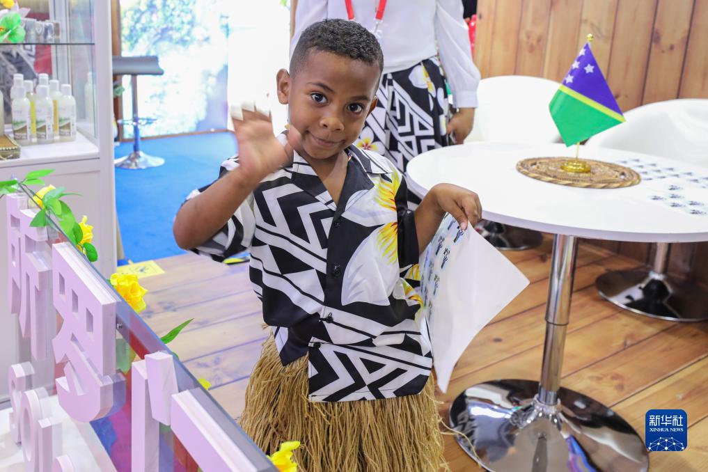 11月6日,一名来自所罗门群岛的小朋友在第六届进博会国家展所罗门群岛展台打招呼。