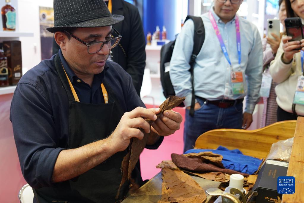 11月7日,展商在第六届进博会国家展古巴展台为观众演示雪茄制作工艺。