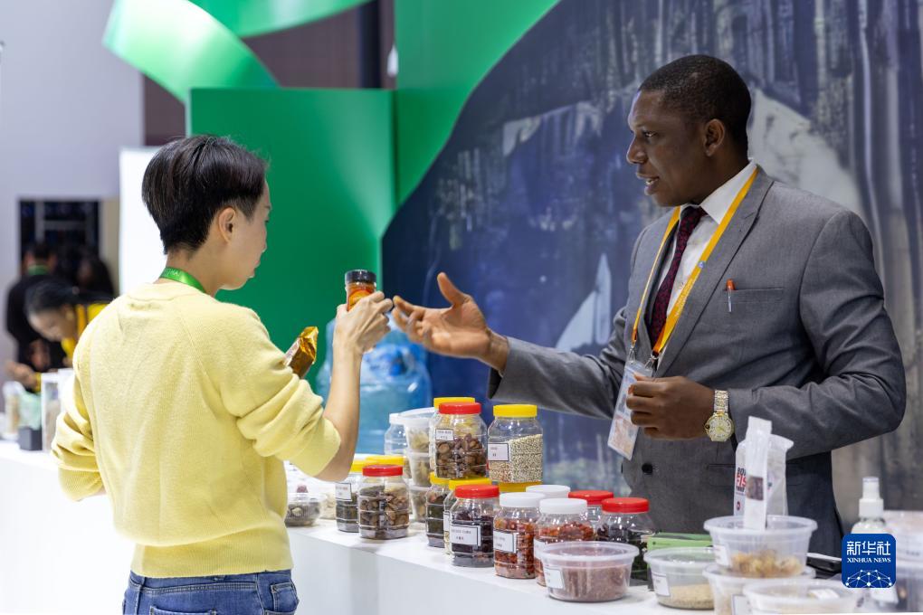 11月7日,在进博会国家馆尼日利亚馆,展商介绍尼日利亚产品。